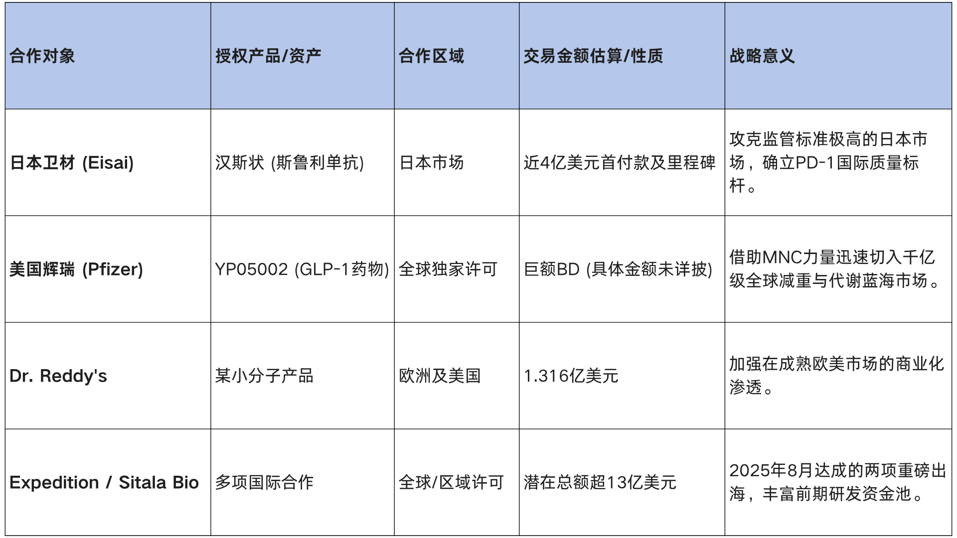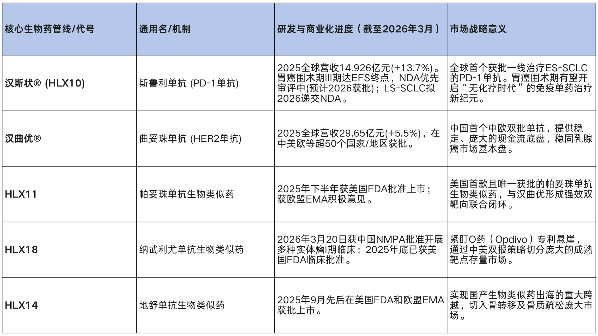 (1)日本高端市场的突破:2026年2月5日,复宏汉霖与日本制药巨头卫材(Eisai)达成了一项总金额接近4亿美元的重磅战略合作协议,将斯鲁利单抗注射液(汉斯状)在日本区域内针对多种肿瘤适应症的开发、生产及商业化权利独家授予卫材。这项交易不仅刷新了国内抗PD-1单抗打入日本市场的BD金额纪录,更标志着汉斯状成功跻身对药品质量、真实世界数据和临床规范要求极为严苛的日本高端医药体系。