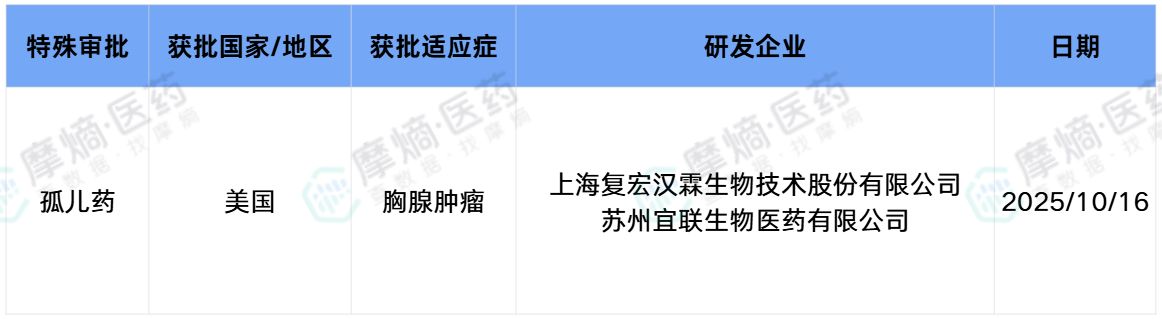 抗体偶联药物(ADC)与双特异性抗体: 复宏汉霖自主研发的HLX43是全球首个进入II期临床试验的PD-L1靶向ADC药物,其设计利用了PD-L1在多种实体瘤中的高表达特性,通过特异性偶联的高效毒素实现精准杀伤,展现出成为“广谱抗癌药”的巨大潜力。并且根据摩熵医药数据显示在2025年10月获得了美国FDA针对胸腺上皮肿瘤(TETs)治疗的孤儿药资格认定(ODD)。