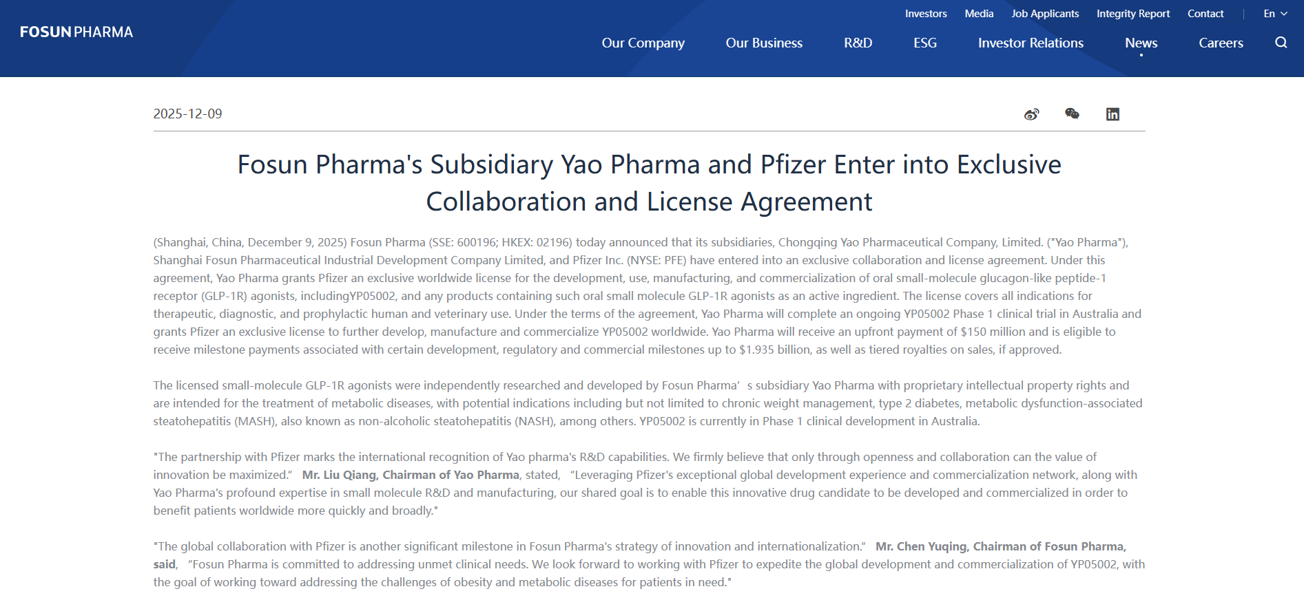 (2)联手辉瑞进军GLP-1蓝海: 在当前全球最为火爆的GLP-1代谢与减重赛道,复星医药也将自主研发的GLP-1创新药物YP05002的全球独家许可协议签给了跨国巨头辉瑞(Pfizer)。借助辉瑞在全球内分泌与代谢领域的深厚商业渠道与临床资源,复星实现了底层分子资产的高溢价变现与风险共担。