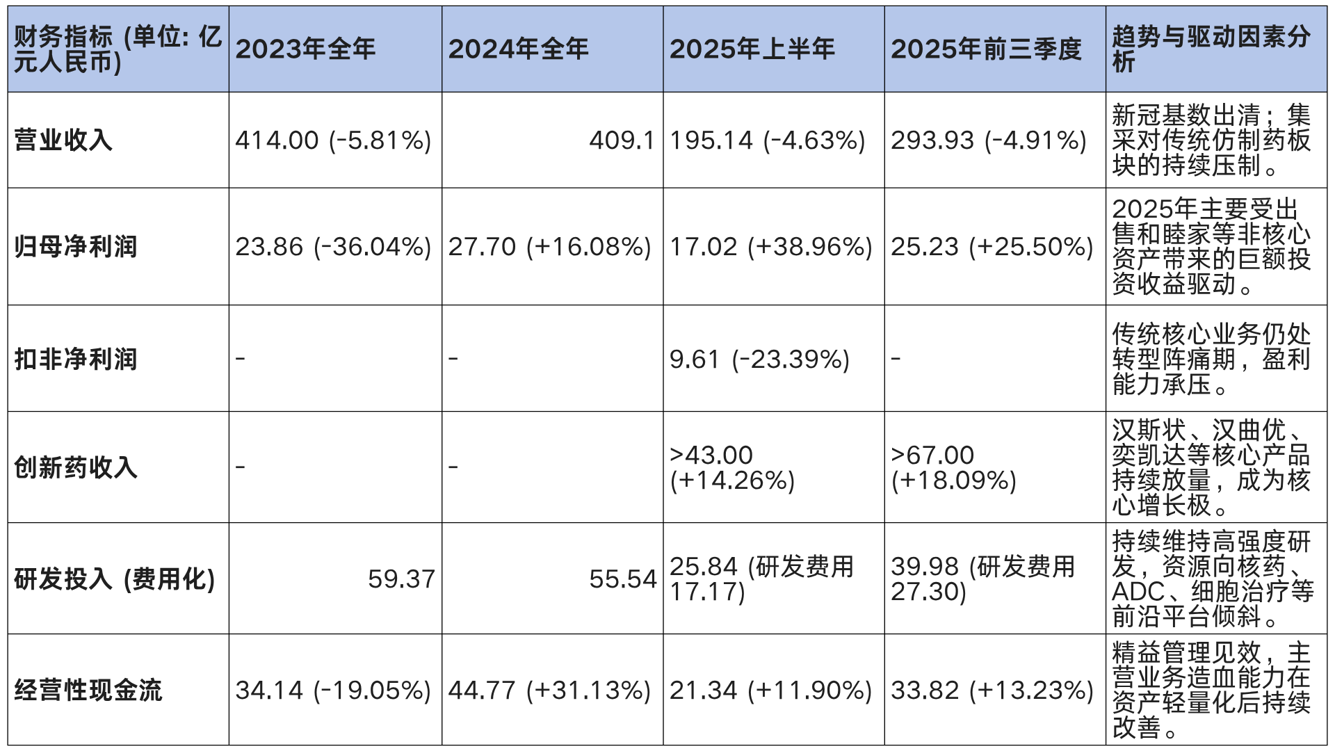 2025年的财务表现则呈现出高度的结构性分化特征,这一阶段的关键词是“增利不增收”。2025年上半年,公司实现营业收入195.14亿元,同比微降4.63%,但归母净利润却逆势大增38.96%至17.02亿元。进一步拆解可知,营收下滑的首要压力来自于国家集采政策的深化,特别是第十批国采平均降幅超60%对传统化学制药板块造成的持续冲击;此外,复杂的国际地缘政治环境也导致部分海外服务交付与收入确认延迟。而净利润的大幅攀升,主要归功于高达21.2亿元的投资收益,这源于公司果断出售和睦家医院剩余权益及其他非核心资产。若剔除这部分非经常性损益,反映主营业务实际盈利水平的扣非净利润为9.61亿元,同比下滑23.39%,表明核心传统业务仍在承受转型期的经营压力。