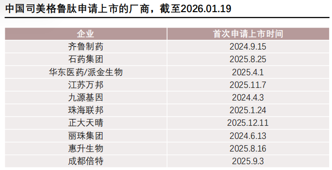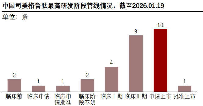 从中国司美格鲁肽的研发进程来看,在最高研发阶段管线情况上,截至2026年1月19日,临床前有2条管线,临床申请阶段1条,临床申请批准阶段1条,临床I期4条,临床III期数量达9条,申请上市阶段有10条,批准上市仅1条。而在申请上市的厂商方面,包含齐鲁制药、石药集团等多家企业,它们首次申请上市时间集中在2024年9月至2025年9月之间。