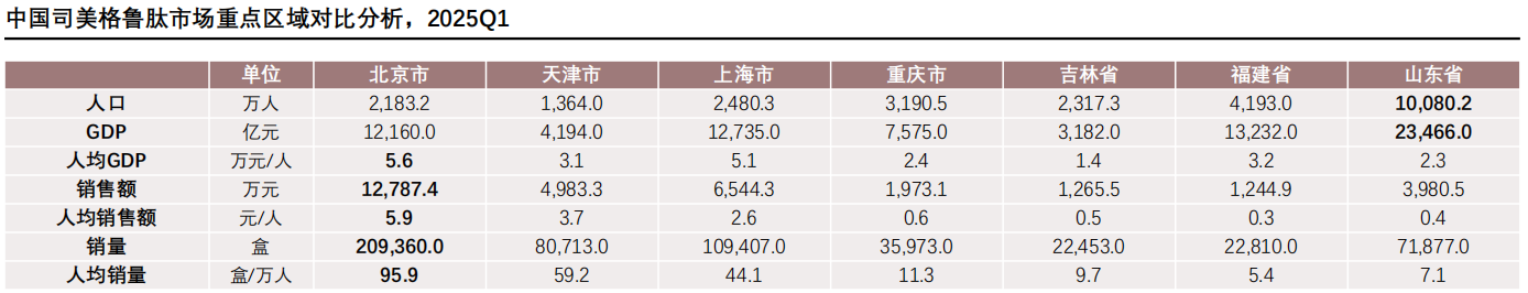 2025Q1中国司美格鲁肽区域市场差异显著,直辖市表现分化明显。北京市以2,183.2万人的人口规模贡献12,787.4万元销售额,人均销售额5.9元/人、人均销量95.9盒/万人均居代表区域首位,这既依托其全国医疗中心的资源聚集效应:三甲医院密集、糖胖病诊疗水平领先,也源于一线城市对GLP-1类药物的深度学术推广与跨区域患者就医需求集中,而2025年初司美格鲁肽肥胖适应症的国内获批,进一步放大了北京市场的需求。