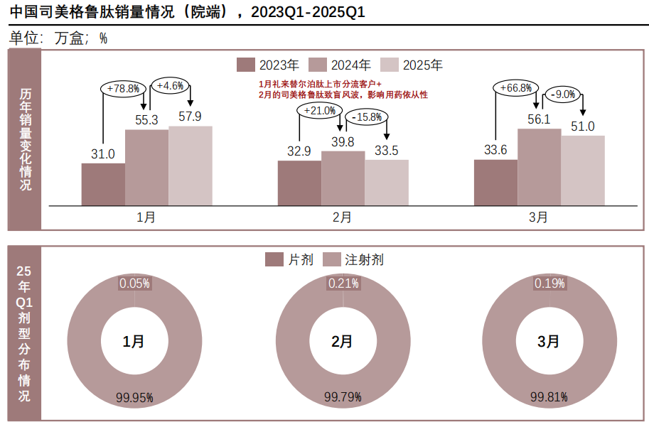 好口碑所带来的持续需求;另一方面,片剂1月全面上市的市场预热也起到了一定推动作用。然而,2月销售额大幅下滑,这主要源于两方面因素:一是1月礼来替尔泊肽正式在中国上