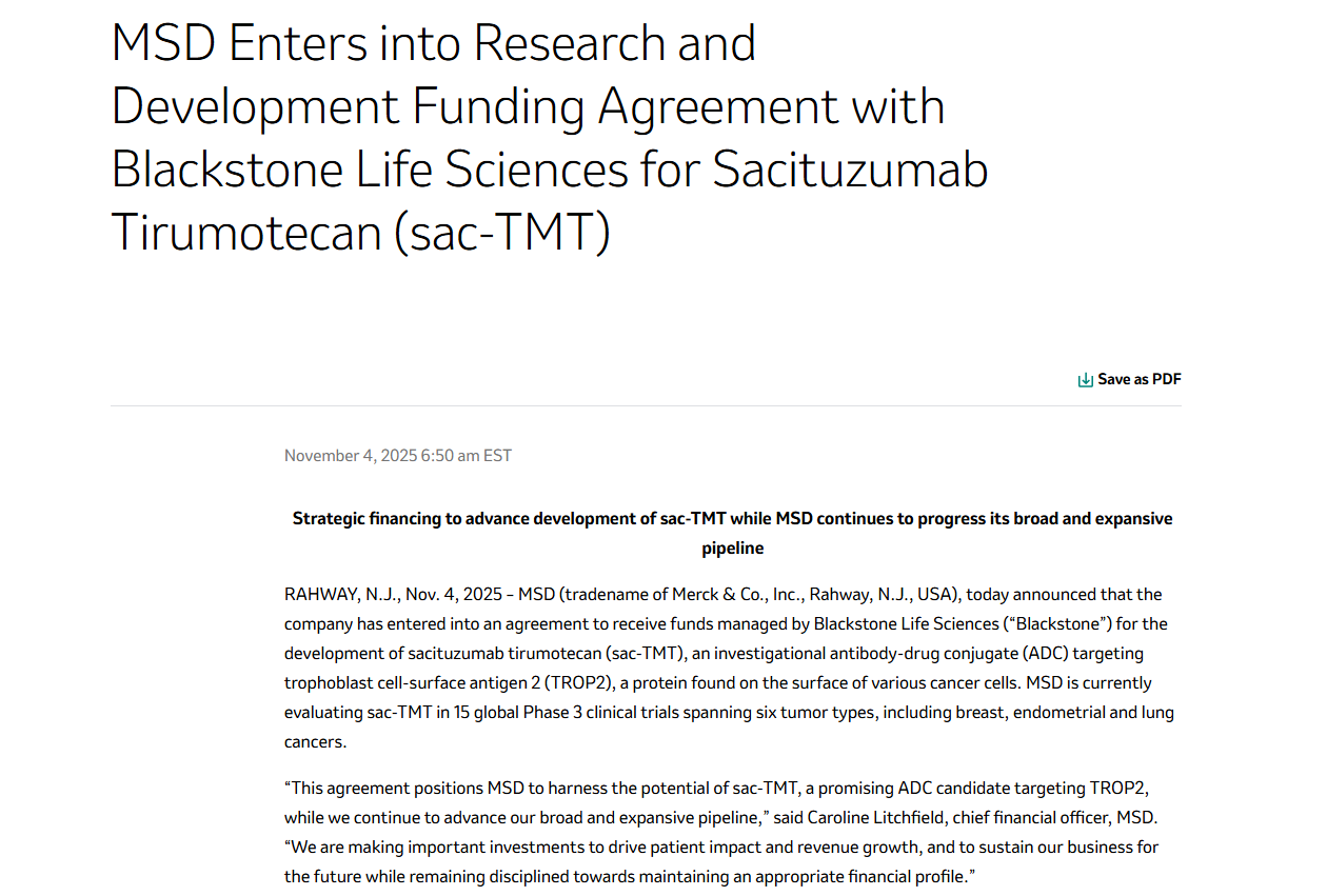 3. 开创性的创新资产金融化路径:2025年11月4日,默沙东与全球顶级私募股权机构黑石生命科学(Blackstone Life Sciences)达成了一项创新协议。黑石承诺出资7亿美元(不可退还),专项用于资助sac-TMT在2026年预计产生的高昂研发与临床成本。作为回报,若sac-TMT未来在美国获批用于一线三阴性乳腺癌(基于TroFuse-011试验),黑石将获得其在全球获批适应症净销售额的低至中等个位数特许权使用费(Royalties)。这一极其罕见的金融合作协议,不仅从侧面验证了国际顶级资本对sac-TMT临床成功确定性的极高认可,也展示了跨国药企如何在不恶化自身资产负债率的前提下,利用金融杠杆为极度“烧钱”的管线引入外部资金的创新破局路径。