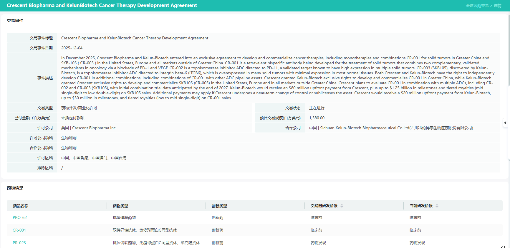 1. 向外授权(License-out):科伦博泰将其靶向整合素β6(ITGB6)并带有拓扑异构酶载荷的ADC药物SKB105(CR-003)的海外权益(美国、欧洲及大中华区以外所有市场)独家授权给Crescent,换取了2000万美元的首付款。