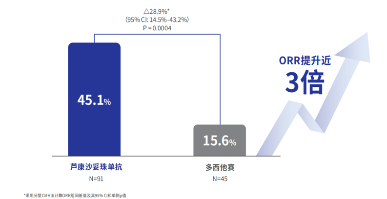 1. 三阴性乳腺癌 (TNBC) 三线及以上治疗:2024年11月获批,用于既往至少接受过2种系统治疗(其中至少1种针对晚期或转移性阶段)的不可切除局部晚期或转移性TNBC成人患者。在极为难治的TNBC中,OptiTROP-Breast01研究显示,由盲态独立中心审查委员会(BICR)评估的客观缓解率(ORR)达到惊人的43.8%,而对照组标准化疗仅为12.8%,确立了其在该领域的终极挽救疗法地位。