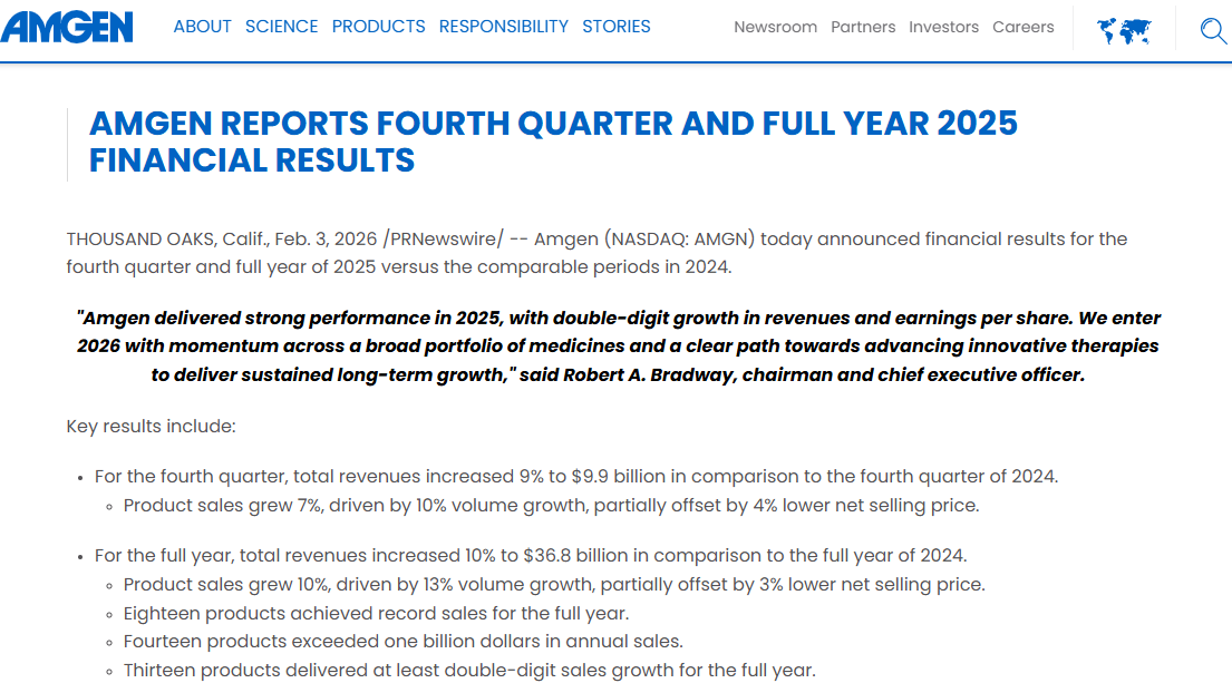 安进在2025年全年总收入达368.0亿美元,同比增长10%。产品销量实现了高达13%的强劲增长,但被净售价3%的下降所部分抵消。骨质疏松药物Prolia和降脂药Repatha等14款产品年销售额均突破10亿美元大关。