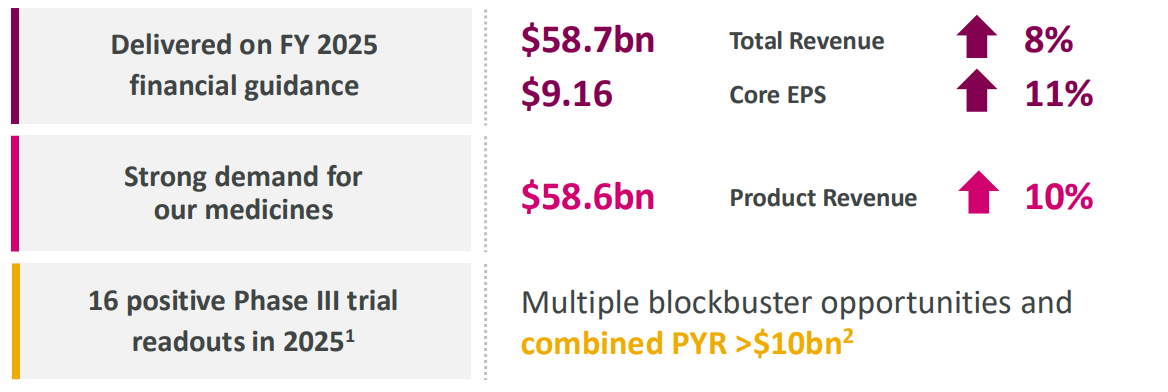 阿斯利康在2025年延续了其强劲的上升势头,全年总营收达到587.39亿美元,按固定汇率(CER)计算增长8%。核心营业利润增长9%,核心每股收益(Core EPS)增长11%至9.16美元,展现出极佳的盈利转化能力。