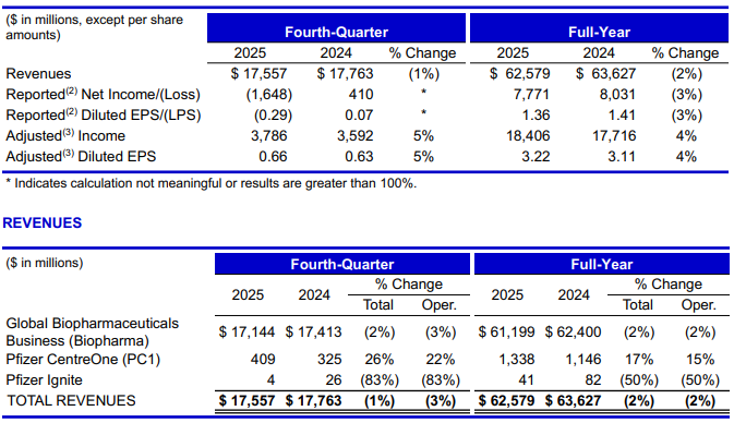 经历了两年因新冠红利消退导致的营收大幅回调后,辉瑞在2025年展现出了明显的企稳与复苏态势。全年总收入为625.79亿美元,同比下降2%。然而,这一表观降幅掩盖了其基础业务的韧性:在剔除新冠产品Paxlovid和Comirnaty的同比基数影响后,辉瑞的其他核心管线实现了6%的运营增长。