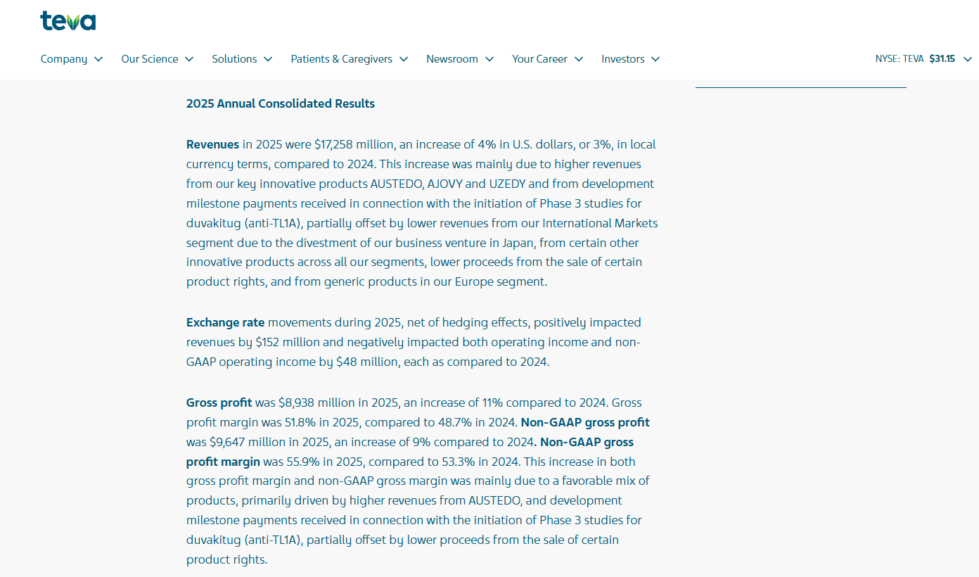 以色列制药巨头梯瓦在2025年彻底走出了此前因阿片类药物诉讼和仿制药价格战导致的长期低迷,实现了连续第三年的营收增长。全年收入达到172.58亿美元,按固定汇率计算增长3%。