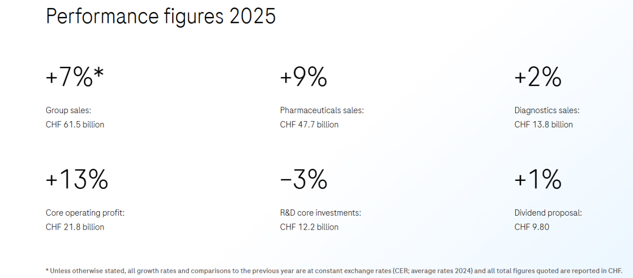 罗氏集团在2025年录得总销售额615.16亿瑞士法郎,按固定汇率(CER)计算增长7%。其中,制药部门销售额为476.69亿瑞郎(增长9%),诊断部门销售额为138.47亿瑞郎(增长2%)。集团核心营业利润达到218.33亿瑞郎,同比增长13%,展现出极佳的利润杠杆。
