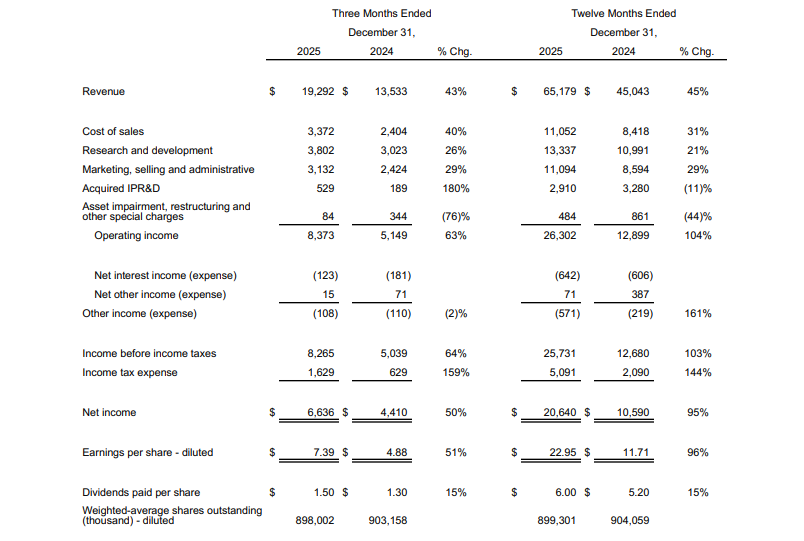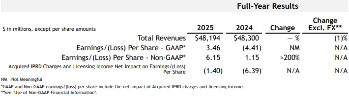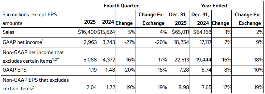 默沙东2025年全球销售额为650.11亿美元,按报告基准同比增长1%(剔除汇率影响后增长2%)。全年GAAP每股收益为7.28美元,非GAAP每股收益为8.98美元(包含与业务开发交易相关的0.20美元每股费用)。
