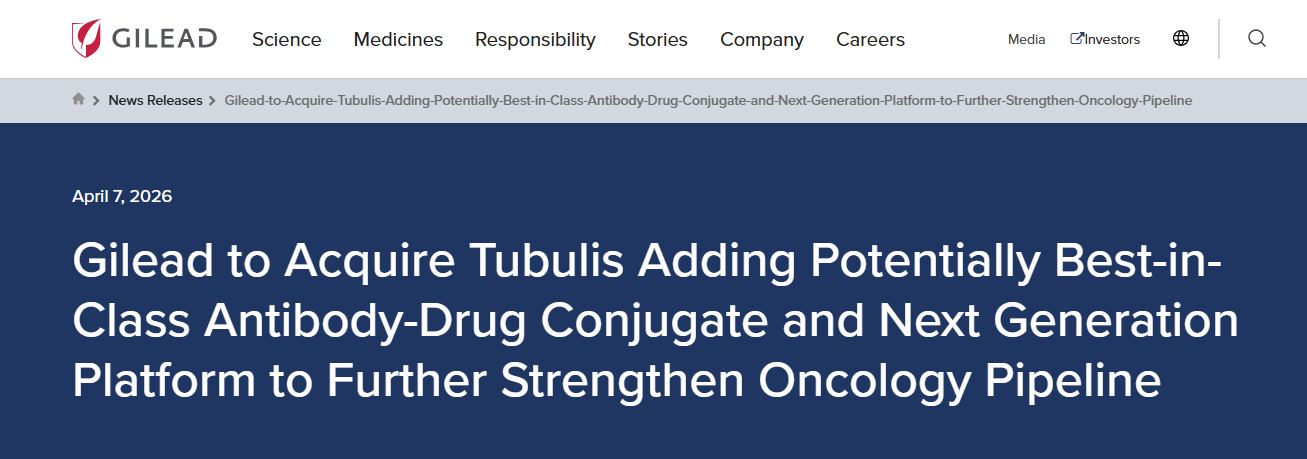 然而,面对HIV市场未来的增量瓶颈,吉利德正试图通过并购将触角延伸至肿瘤领域。2026年,吉利德宣布收购Tubulis,成功引入了潜在的“Best-in-Class”下一代抗体偶联药物(ADC)平台及管线资产,试图复制并超越Trodelvy的路径,在乳腺癌及其他实体瘤市场确立新的立足点。