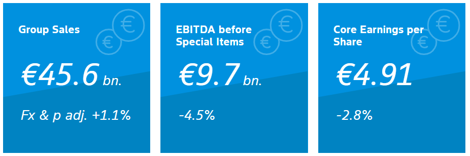拜耳集团2025年实现了456.0亿欧元的总销售额,经汇率和产品组合调整后(Fx & p adj.)微增1.1%。然而,集团扣除特殊项目前的EBITDA下降了4.5%至97.0亿欧元,核心每股收益降至4.91欧元(-2.8%)。