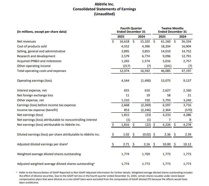 艾伯维在2025年交出了一份令整个华尔街瞩目的财报。面对史上最畅销药物Humira(阿达木单抗)遭遇生物类似药全面围剿的恶劣局面,公司实现了全年净收入611.60亿美元,按报告基准增长8.6%,按运营基准增长8.5%。