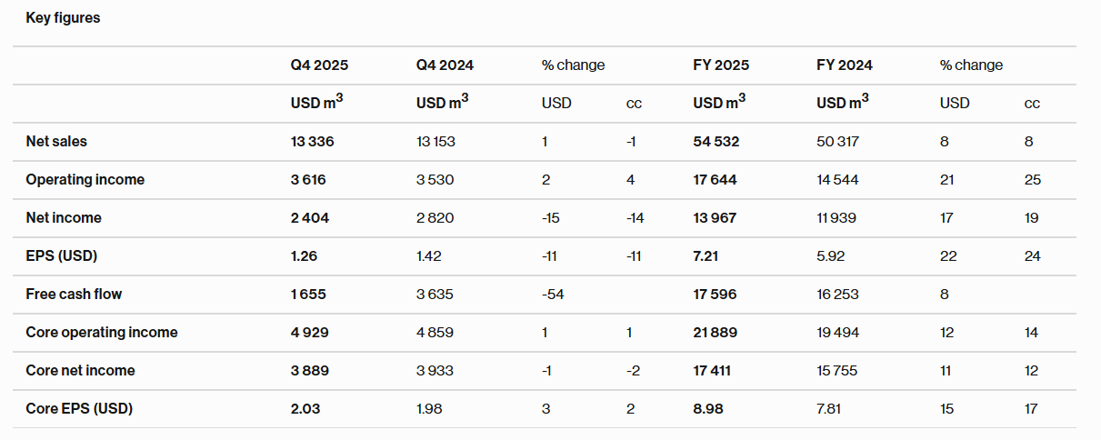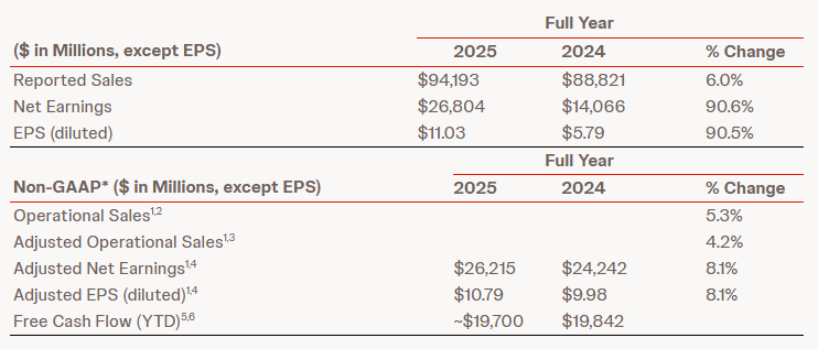 在全面剥离消费者健康业务Kenvue之后,强生作为一家纯粹的医疗健康企业,在2025年展现出了强大的盈利与增长能力。全年报告销售额达到941.93亿美元,同比增长6.0%(经调整后运营增长率为4.2%)。全年净利润达到268.04亿美元,摊薄每股收益(EPS)为11.03美元。