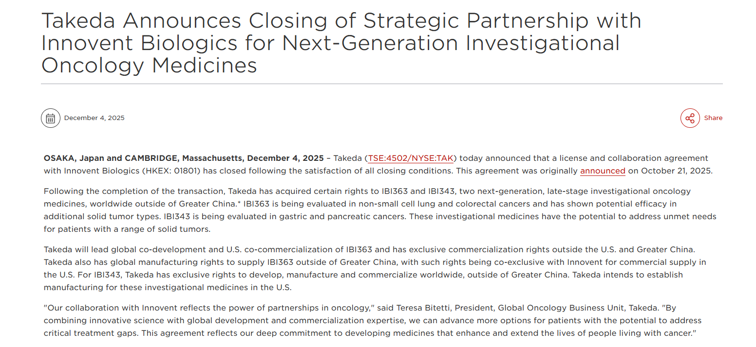 在其2025财年上半年(截至2025年9月),武田营收按CER计下降3.9%,核心营业利润下降8.8%。这一业绩下滑的核心原因在于其重磅ADHD(注意力缺陷多动障碍)药物Vyvanse遭遇了多款仿制药的全面竞争,导致美国市场的利润池被迅速摊薄。为了应对这一阵痛期并重塑长期管线,武田积极投身具有高护城河的肿瘤领域。2025年底,武田与中国创新药企信达生物达成战略合作,引进下一代抗肿瘤管线,以期补充自身在实体瘤领域的火力。