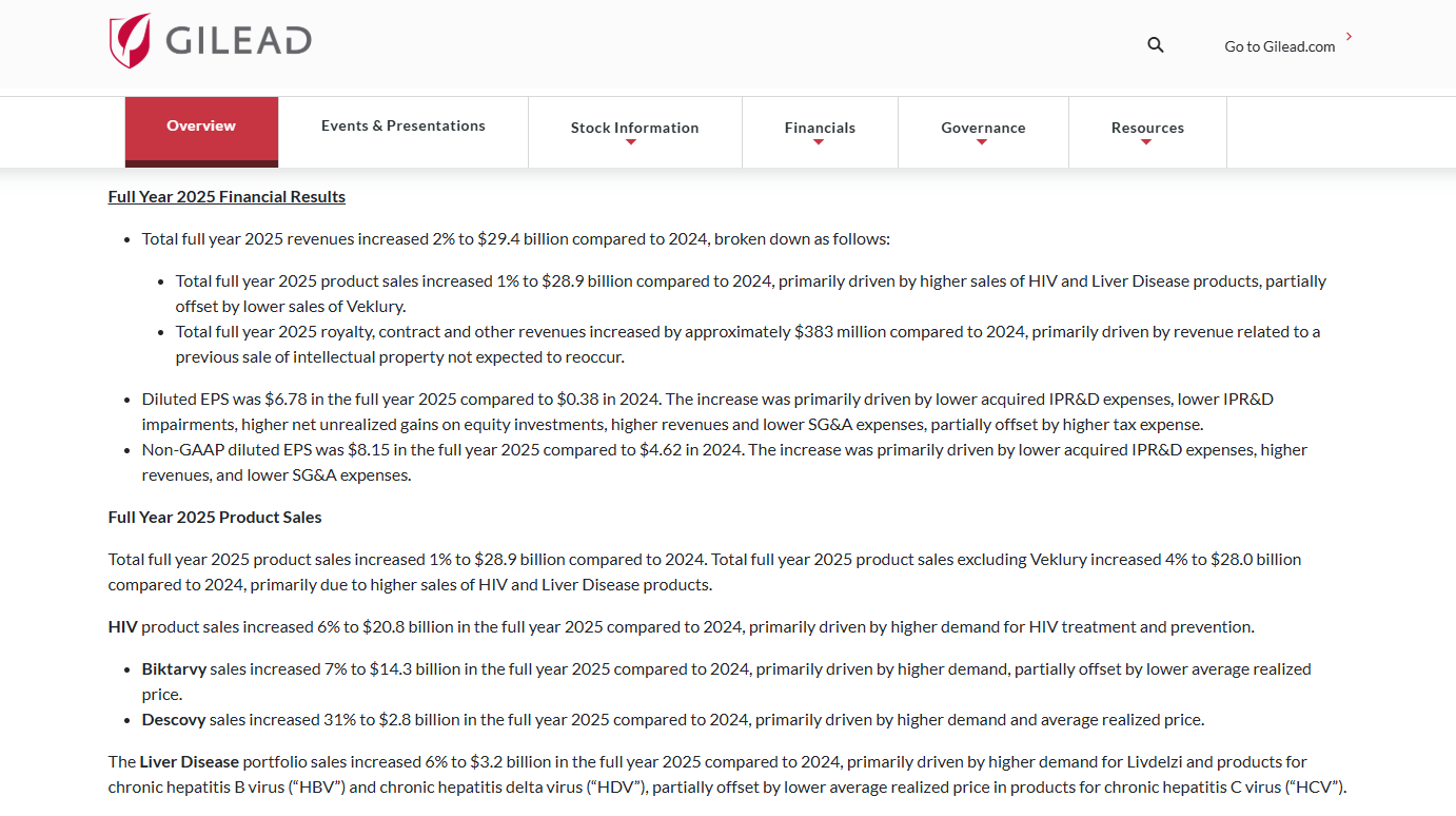 吉利德在2025年全年营收达到294.0亿美元,同比增长2%。