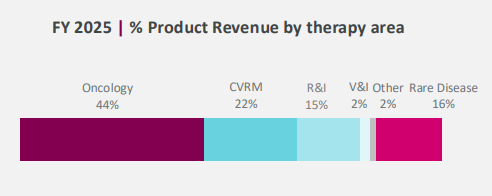 核心业务与管线驱动机制:阿斯利康目前的管线深度和广度在同业中名列前茅,拥有多达16个年销售额超10亿美元的“重磅炸弹”药物。肿瘤业务是其绝对的核心引擎,占产品总收入的44%;其次是心血管、肾脏及代谢疾病(CVRM,占22%)、罕见病(占16%)和呼吸及免疫(R&I,占15%)。