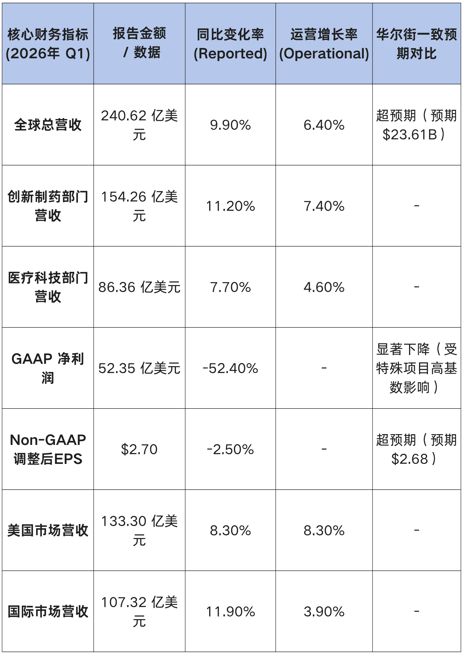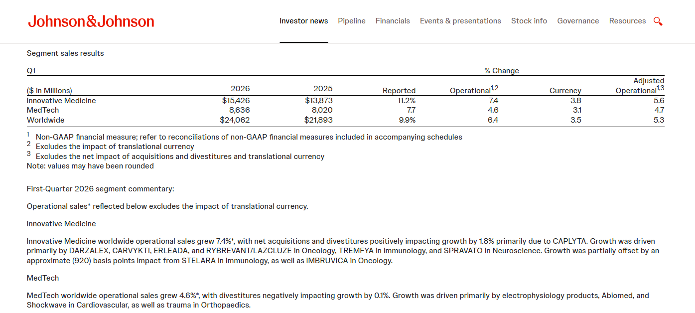 2026年4月14日盘前发布的强生第一季度财报,向华尔街传递了极度强烈的信心信号。这一季度不仅是对Stelara生物类似药冲击的第一次“真实压力测试”,更是强生新产品线增长弹性的全面检阅。