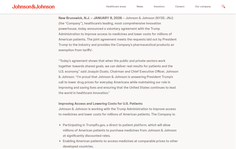 《通胀削减法案》(IRA)的医保价格谈判机制在2026年正式进入实质性杀伤阶段。强生的血液稀释剂Xarelto(利伐沙班)、Stelara和Imbruvica不幸成为首批谈判的牺牲品,其中Xarelto的2026年谈判价格较2023年断崖式暴跌逾60%,这对利润率构成了严峻挑战。然而,在应对2026年初特朗普政府出台的激进贸易与关税政策时,强生展现出了卓越的政治远见。2026年1月8日,强生宣布与美国政府达成自愿协议,通过TrumpRx.gov直接面向患者平台提供极端折扣,并在医疗补助体系内对标国际最低价格。