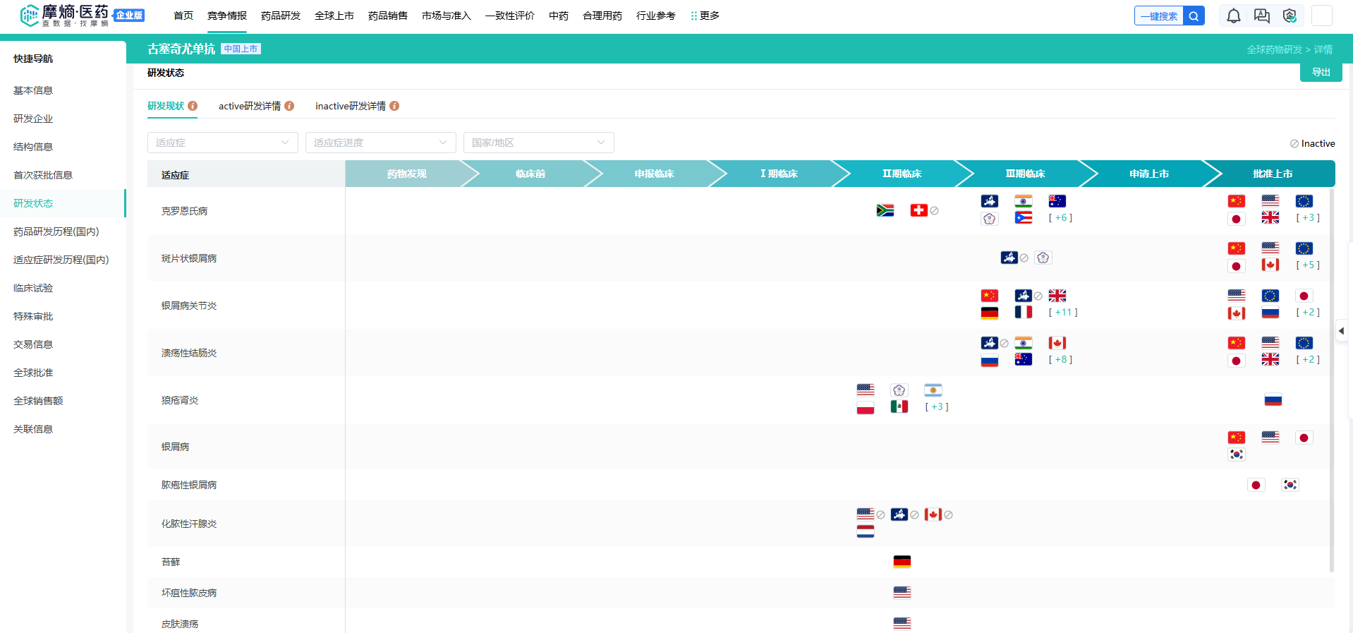 强生在免疫学领域的管线更替,实质上反映了靶点生命周期管理的行业趋势。根据摩熵医药数据库-靶点格局数据库截至2026年3月的数据提取分析,全球针对IL-23/IL-23R靶点的上市阶段药物已达数十款,单克隆抗体赛道(如Tremfya、Skyrizi等)的适应症开发已趋近饱和,同质化竞争显著。