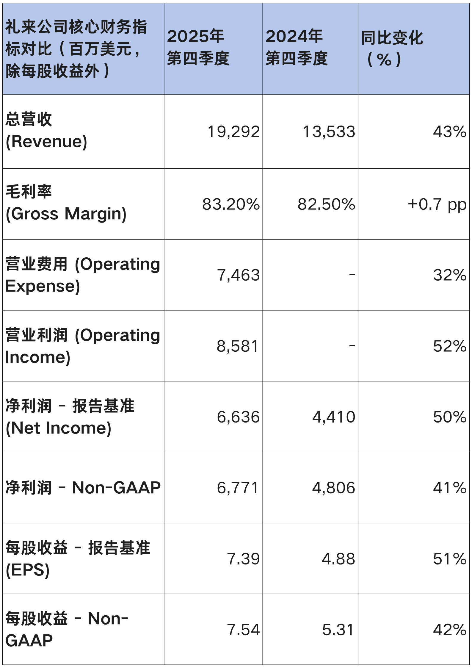 在2025财年,礼来总营收达到了惊人的652亿美元,相较于2024年的450亿美元,实现了高达45%的年度跃升。这种超大体量的非线性增长,在百年制药史上实属罕见。具体到2025年第四季度,单季营收同比猛增43%,达到192.92亿美元,远远超过了华尔街普遍预期的179亿美元均值。