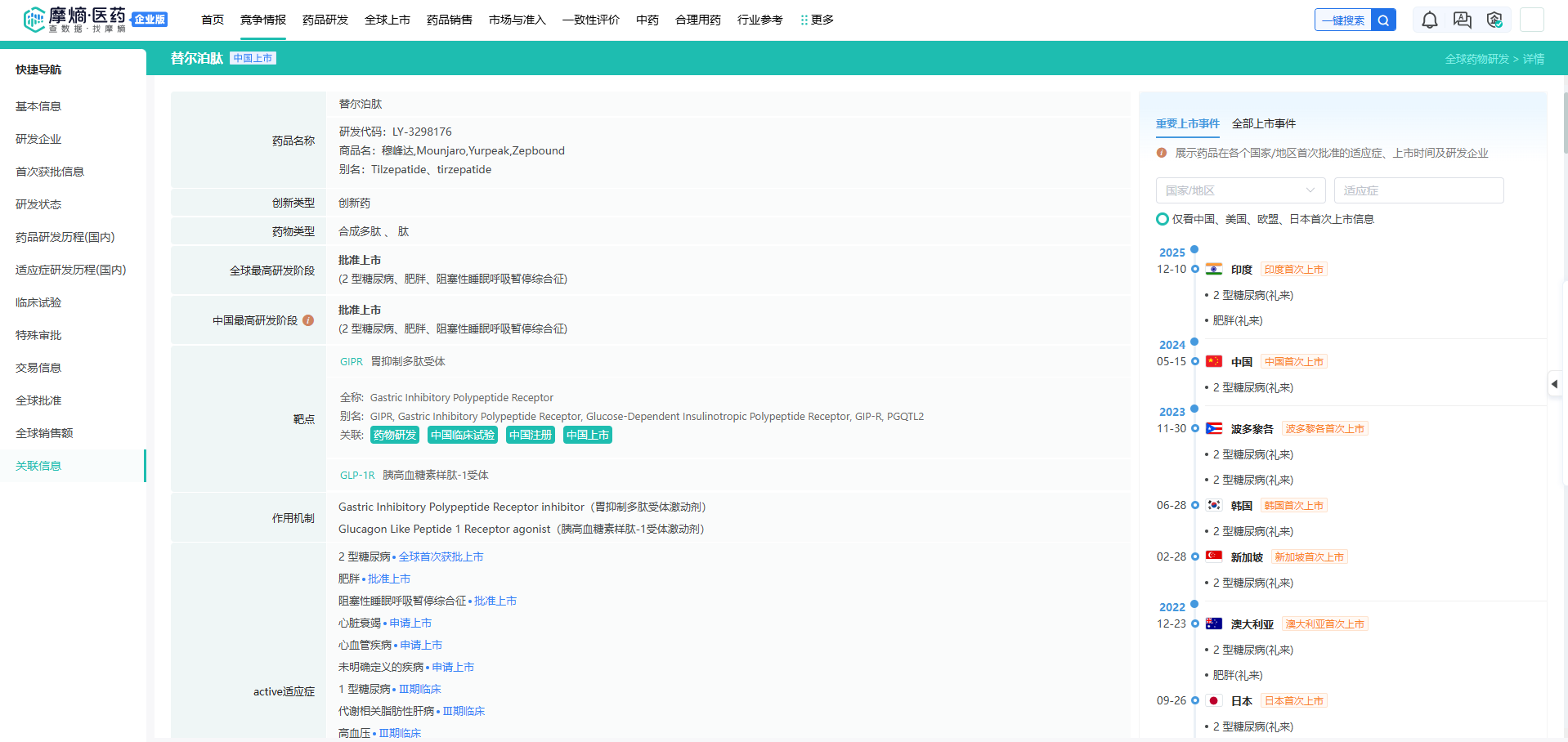 礼来心脏代谢健康高级副总裁Thomas Seck博士指出,这是该药物连续第七个取得积极结果的三期试验,累计受试者超过11000人。凭借这些数据,礼来计划在2026年第二季度末向美国FDA提交Foundayo用于治疗2型糖尿病的上市申请,并在欧盟、日本同步推进其肥胖症的上市审批,摩熵医药数据库的全球药物研发系统正密切跟踪这一有望重塑基层医疗市场的里程碑事件。作为一种化学合成小分子,Foundayo的制造成本相较于大分子多肽呈指数级下降,这将使其成为礼来下沉至全球广阔基层医疗市场和中低收入国家的最强武器。