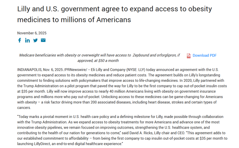 2026年,礼来在支付端最具历史意义的举措是与特朗普政府达成了里程碑式的最惠国定价(MFN)及Medicare扩张协议。自2026年4月1日起,Medicare受益人每月只需支付最高50美元的自付费用即可获得Zepbound或Orforglipron。而作为回报,通过政府设立的TrumpRx平台,这些药物的联邦采购指导价被降低至245美元/月左右。