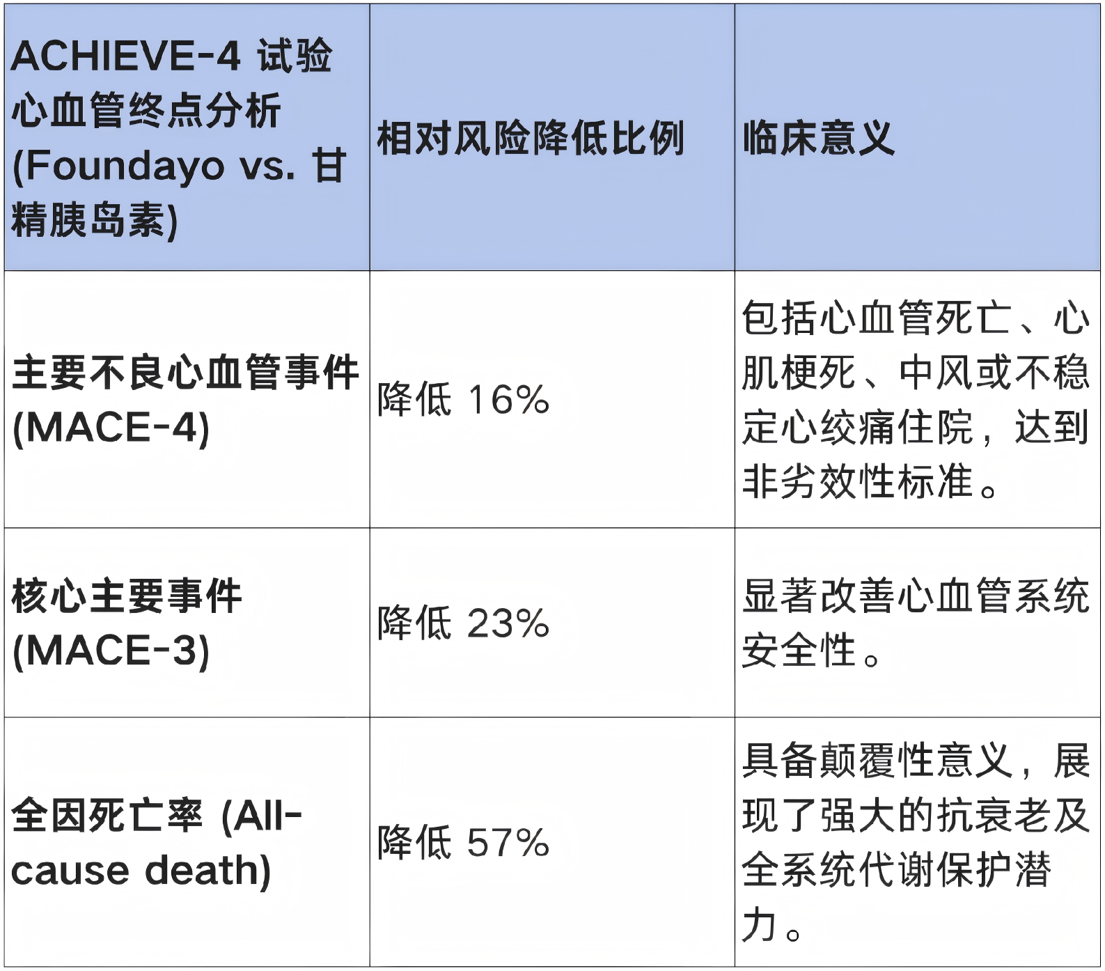 最新公布的Phase 3 ACHIEVE-4试验结果(该试验在15个国家招募了2700多名受试者,是迄今为止规模最大、时间最长的研究)彻底颠覆了医学界对小分子降糖药的认知。在与基础甘精胰岛素(insulin glargine)的头对头比较中,Foundayo不仅在52周和104周均表现出优越的A1C控制和体重减轻,更在心血管预后上取得了历史性突破。