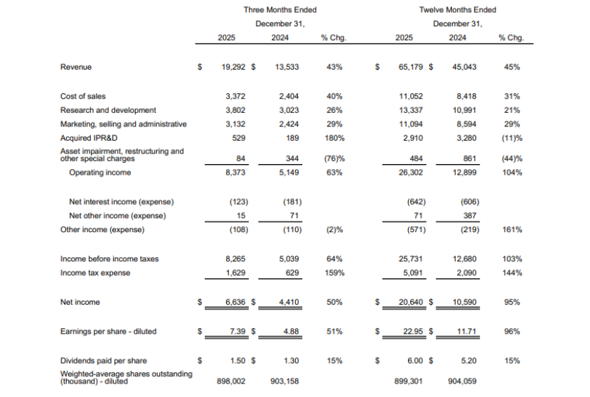 第四季度毛利率提升至83.2%,同比优化了0.7个百分点。这种毛利率的扩张,主要归功于高端创新药产品组合的放量极大摊薄了固定制造成本。尽管研发费用因多项处于后期的临床项目而持续加速投入,其营业利润依然高达85.81亿美元,同比大增52%。在计入了每股0.52美元的已获知识产权研发(Acquired IPR&D)费用的沉重负担后,Non-GAAP EPS仍录得7.54美元,同比大涨42%。