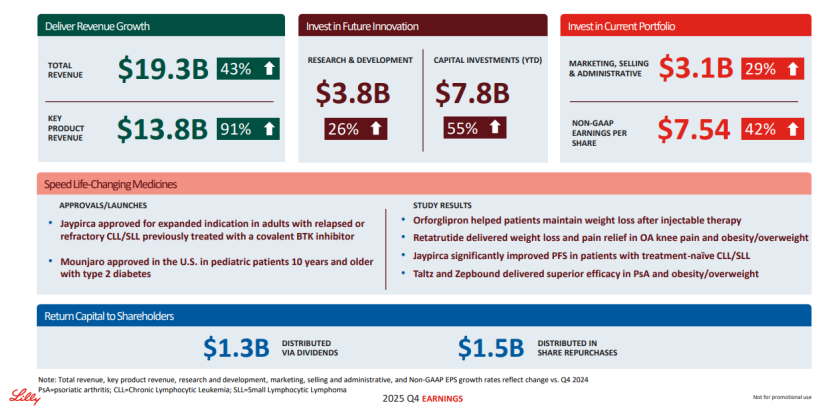 驱动这一增长的核心引擎毫无疑问是Mounjaro和Zepbound。这两款基于Tirzepatide的药物在2025年全年的合并销售额突破了360亿美元。在第四季度,Mounjaro单品创造了74亿美元的季度收入,同比飙升110%,轻松击穿了分析师66亿美元的预测;而Zepbound的销量增幅更是达到了123%。两款药物在四季度合计贡献了117亿美元,占据了公司当季总营收的绝对主导地位。利润表维度的表现同样堪称教科书级别。
