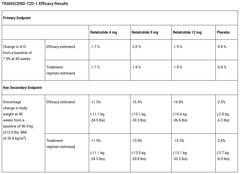 2026年第一季度密集披露的两项后期试验数据确立了其“Triple G”时代的霸主地位。在针对饮食与运动控制不佳的2型糖尿病患者的Phase 3 TRANSCEND-T2D-1试验中,就主要终点而言,采用疗效指标,治疗40周后,Retatrutide使A1C指标大幅下降达2.0%;对于一项关键的次要终点,使用疗效评估指标,服用瑞他曲肽的参与者平均减重高达 36.6 磅(16.8%)。体重减轻持续到治疗期结束。