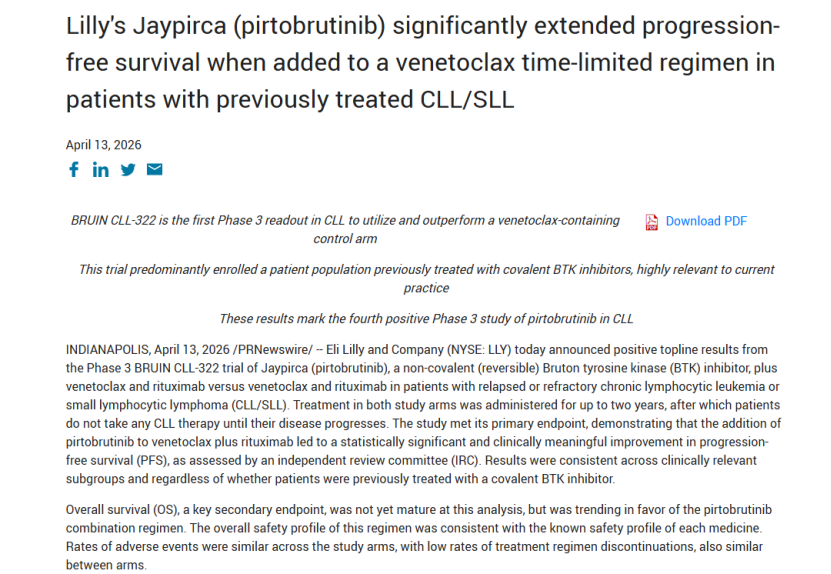2026年4月13日,礼来宣布其非共价(可逆)BTK抑制剂Jaypirca在Phase 3 BRUIN CLL-322试验中大获全胜,这是该药物在慢性淋巴细胞白血病或小淋巴细胞淋巴瘤(CLL/SLL)领域取得的第四个三期临床里程碑。