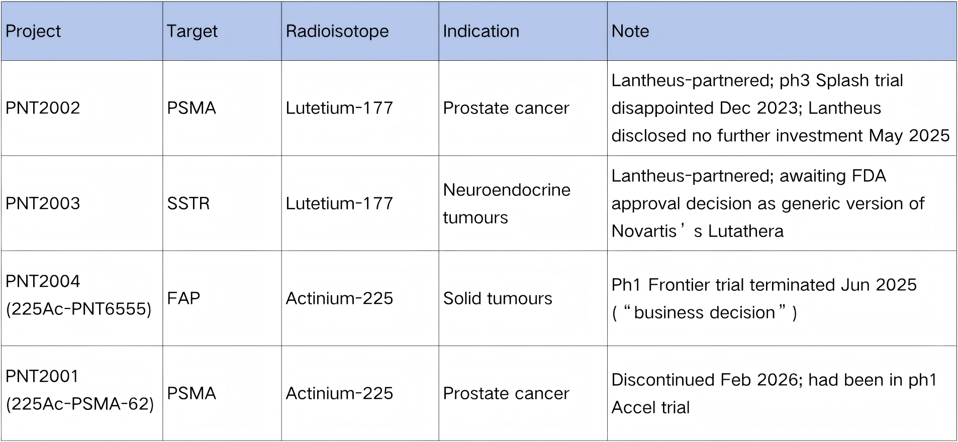 礼来在2023年斥资14亿美元收购Point Biopharma进军该领域,但随后接连遭遇挫折。2026年2月的四季度财报会议上,礼来证实已终止了Point最初的候选核药项目——利用α发射体锕-225(Actinium-225)靶向PSMA的PNT2001,以及靶向FAP的PNT6555一期试验。而其曾寄予厚望的靶向PSMA的镥-177(Lutetium-177)药物PNT2002也在三期Splash试验中表现不佳,合作伙伴Lantheus已停止对其追加投资。目前原Point管线中仅剩PNT2003(诺华Lutathera的仿制药)正等待FDA作为通用名药品的审批决断。