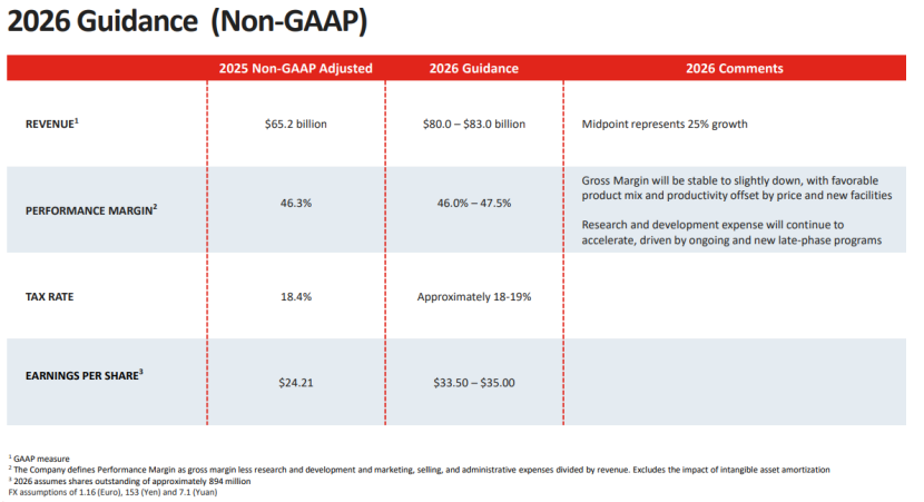 展望2026年全年,CEO David Ricks与管理层给出了极其强悍的前瞻指引:预计2026年全年营收将在800亿美元至830亿美元之间(中值对应约25%的年增长率),Non-GAAP EPS则设定在33.50美元至35.00美元区间(中值增幅高达49%)。