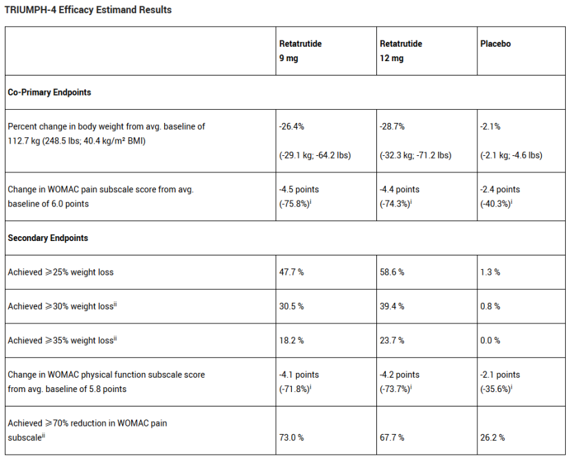 在更具开创性的Phase 3 TRIUMPH-4试验中(针对伴有膝骨关节炎的非糖尿病肥胖患者),Retatrutide最高剂量(12毫克)在68周时实现了惊人的平均28.7%(71.2磅)的体重减轻。高达28.7%的减重幅度已经触及甚至超越了传统的Roux-en-Y胃旁路手术效果。同时,患者的WOMAC疼痛评分大幅下降了平均4.5分(75.8%),超过八分之一的患者实现了膝关节疼痛的完全缓解。