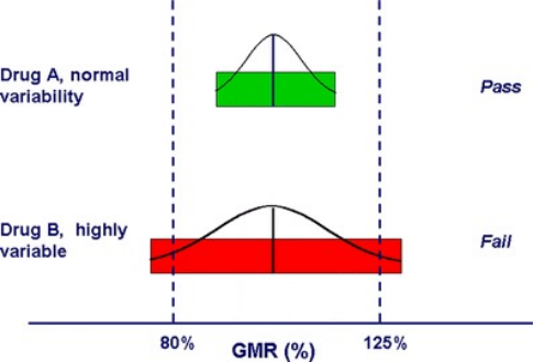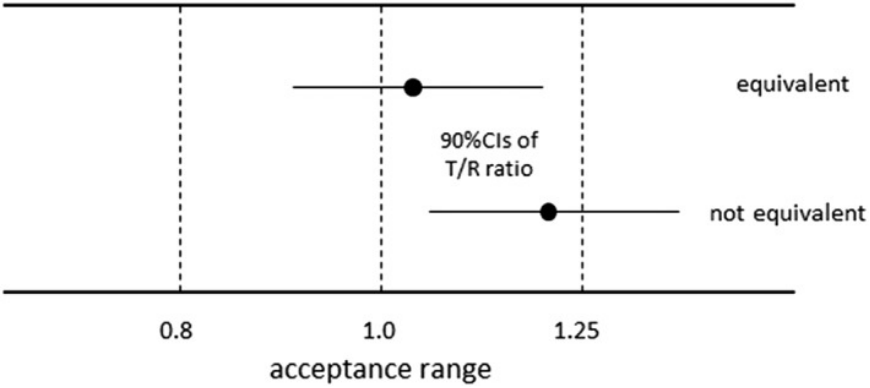 一般情况下,判定等效的铁律是受试药品与参比药品的 Cmax 和 AUC 的 GMR 的 90%CI 必须完全落入 80.00% ~ 125.00% 的区间内。但这并非放之四海而皆准。