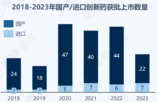 在获批上市方面,2020年获批创新药数量最多,国产达到47款,进口5款;整体来看,国产获批数量显著多于进口数量。
