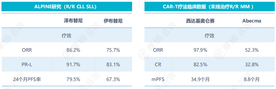 百济神州的泽布替尼和传奇生物的西达基奥仑赛等创新药在国际市场上取得了显著成果。BTK抑制剂泽布替尼在头对头ALPINE试验中击败伊布替尼,成为目前全球首个且唯一一款对比伊布替尼,取得无进展生存期(PFS)与总缓解率(ORR)双重优效性的BTK抑制剂。