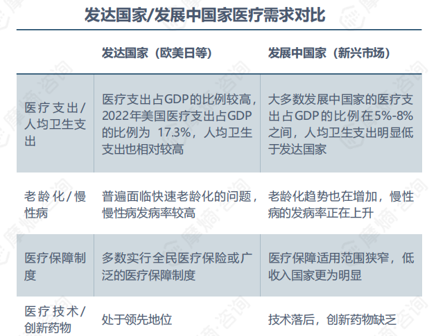 新兴市场存在迫切的医疗需求。发达国家医疗支出占GDP的比例较高,人均卫生支出也相对较高,国家实行广泛的医疗保障制度,在医疗技术、创新药物研发等方面处于领先地位;而大多数发展中国家的医疗支出占GDP的比例在5%~8%之间,老龄化趋势及慢性病发病率增长显著,同时医疗技术相对落后,这为中国药企出海在国际市场占据一席之地提供了发展机遇。
