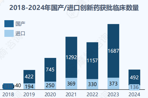 我国本土药企的创新能力逐渐成熟,获批创新药数量增加显著。根据摩熵医药数据统计,自2018年起我国国产创新药获批临床数量(按受理号计)显著增长,其中2021、2022年获批数量分别达1292、1157件并于2023年达历史新高1687件。