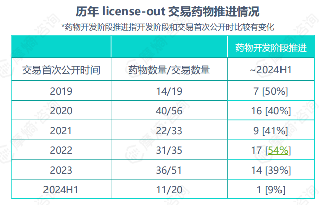 在2019年至2024年上半年公布的214起“出海”授权许可交易中,涉及具体药物共194个;其中在授权许可交易后,开发阶段推进的药物有79个(约41%)。