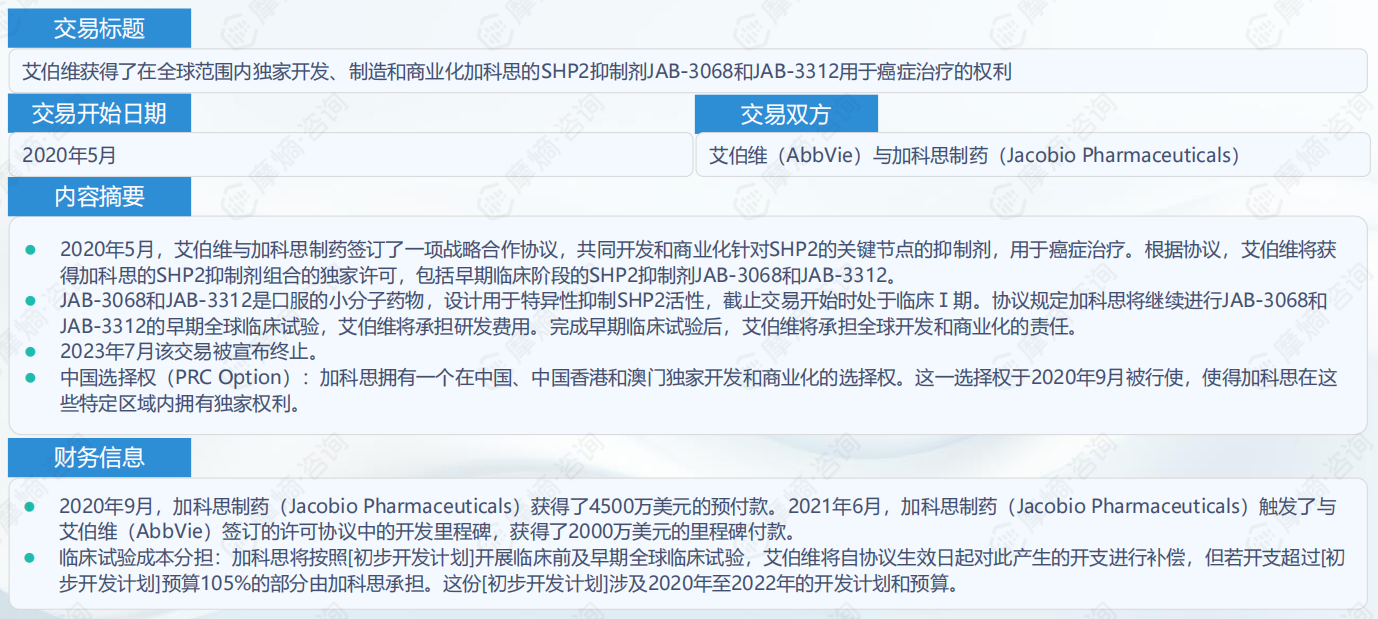 2020年5月,艾伯维与加科思制药签订了一项战略合作协议,共同开发和商业化针对SHP2关键节点的抑制剂,用于癌症治疗。根据协议,艾伯维将获得加科思的SHP2抑制剂组合的独家许可,包括早期临床阶段的SHP2抑制剂JAB-3068和JAB-3312。