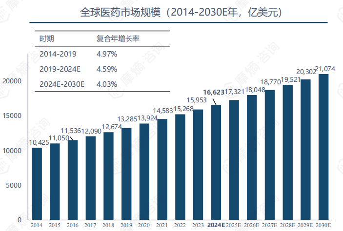 全球医药市场规模呈现稳步增长态势。根据摩熵医药分析,2024年全球医药市场规模约 1.66 万亿美元,预计至2030年将增长至 2.11 万亿美元,年复合增长率预计在 2024~2030 年将达 4.03%。全球医药市场的持续增长为我国药企出海提供了广阔的市场空间。