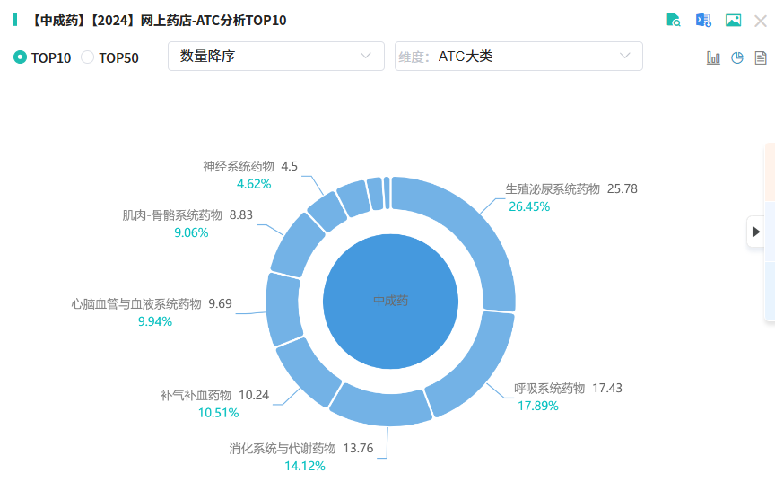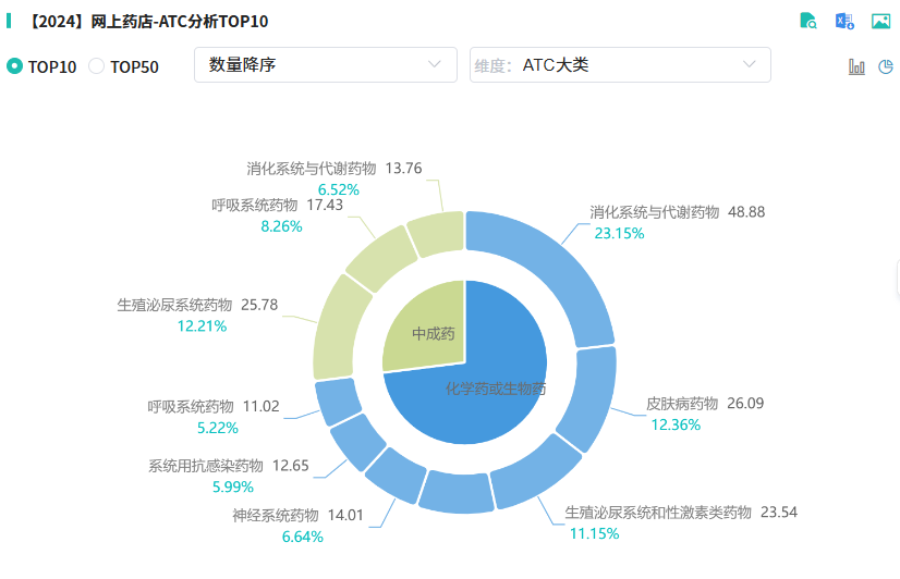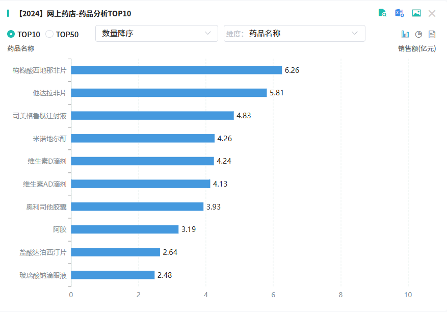 从品种销售排名来看,2024年网上药店排名前10的品种占总市场份额的14%,其中有6款超4亿元的品种,枸橼酸西地那非片、他达拉非片2款抗ED“神药”稳守榜单前列。