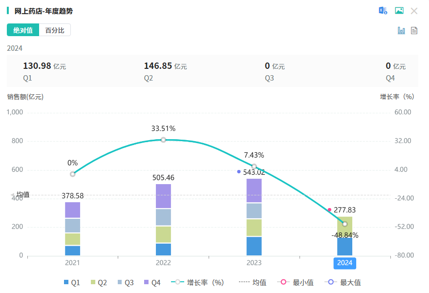 近年来中国网上药店终端药品(化学药+生物药+中成药)销售额逐年攀升,据摩熵医药数据库显示,网上药店从2020年的378.58亿元增加至2023年的543.02亿元;2024年(截至Q2季度)销售额已超过270亿元,同比增长达到了7.17%,全年销售额有望突破600亿元,市场潜力可期。