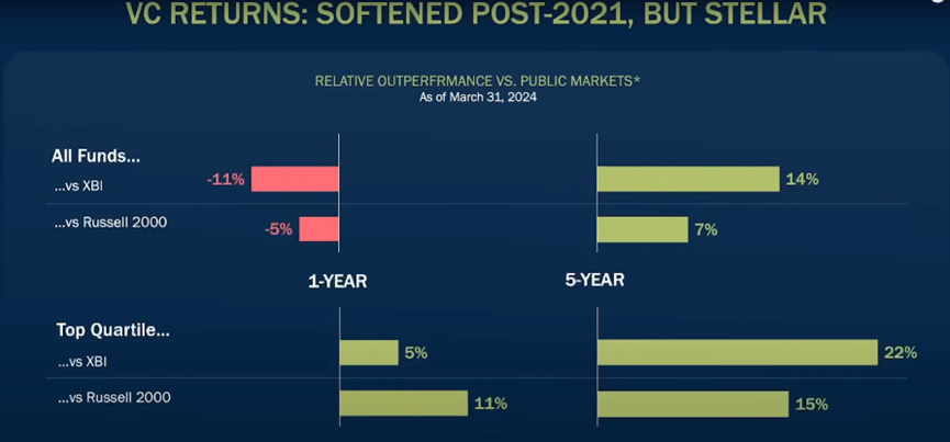 尽管在2021年后风投回报有所减弱,但总体表现仍然优秀。从1年期来看,所有风投基金的回报率低于XBI和Russell 2000指数;然而,从5年期的表现来看,风投基金的回报率却超过了这两个指数。值得注意的是,排名前四分之一的风投基金在1年期和5年期的回报率都明显优于XBI和Russell 2000,显示出它们在长期投资中的竞争力和出色的增长潜力。