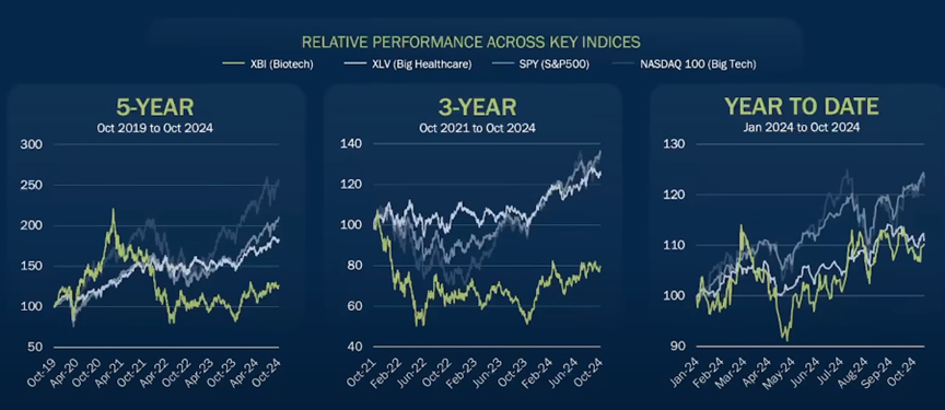过去五年,科技巨头(纳斯达克100指数)上涨超过150%,标普500指数上涨超过100%,大健康板块(XLV)紧随其后。而生物科技板块(XBI)明显落后于其他主要指数。