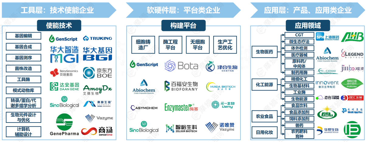 使能技术:基因编辑、基因合成、基因测序、菌株改造、工具酶、模式动物库、转录/蛋白/代谢多组学分析、生物元件设计与优化、计算机辅助设计。